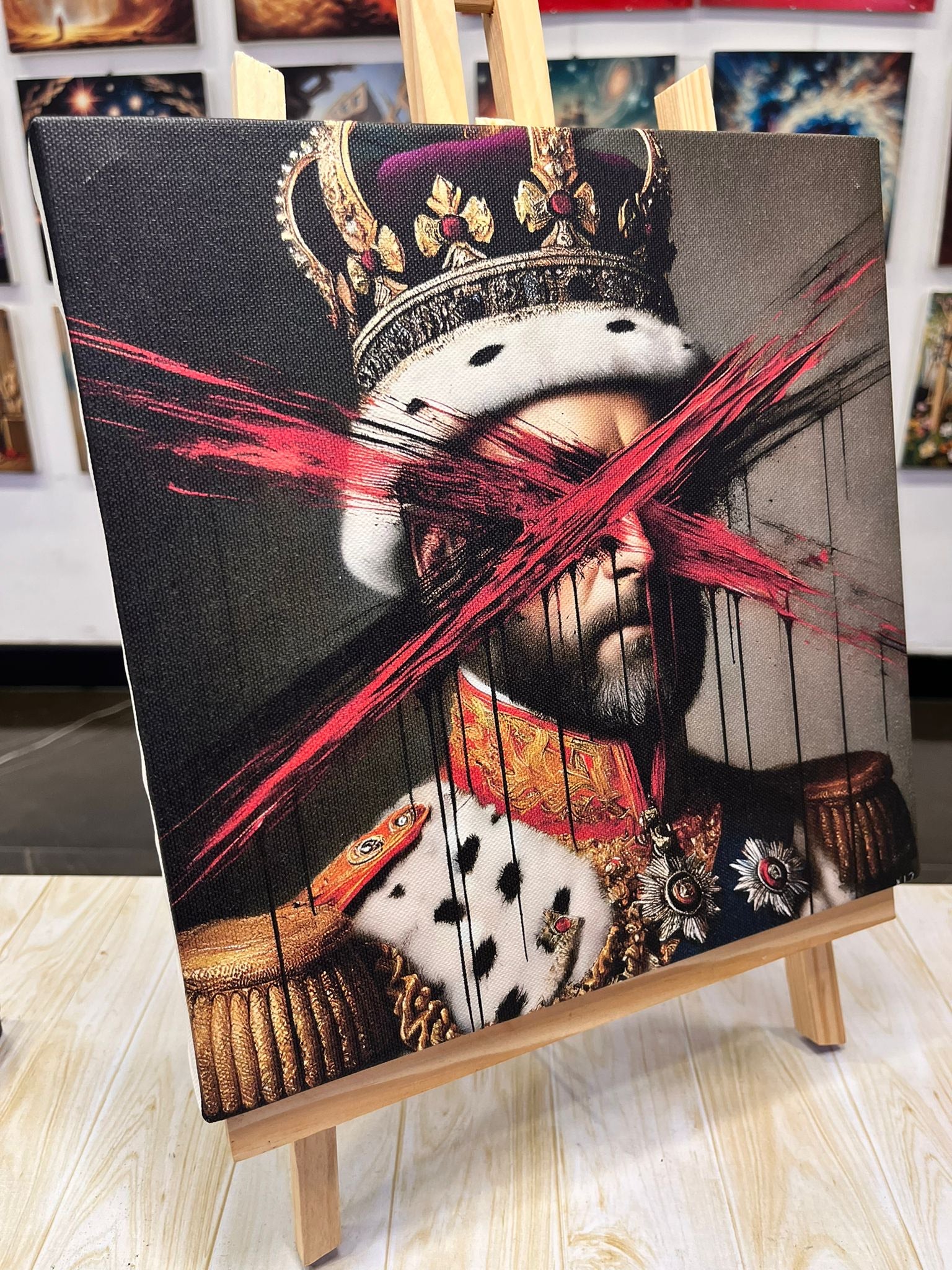 A striking portrayal of a king's face obscured by bold red Xs, symbolizing the loss of vision or morality in the pursuit of power.